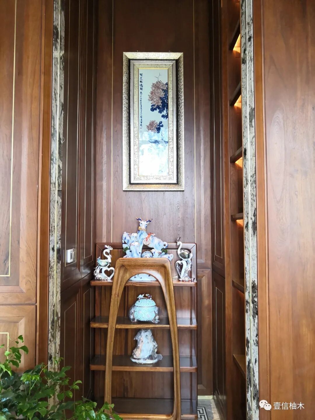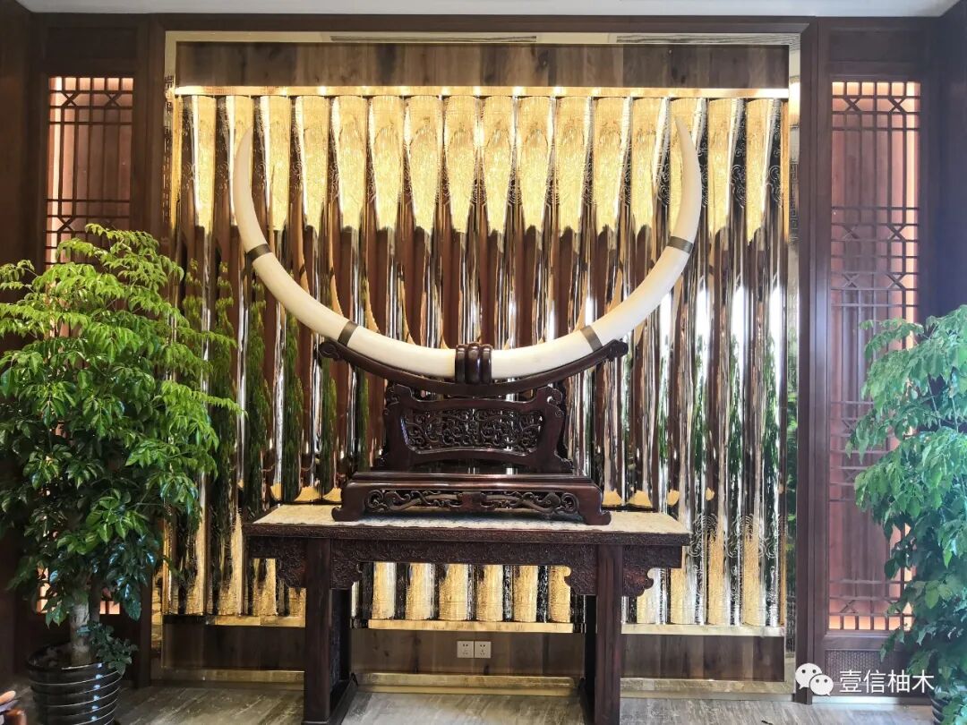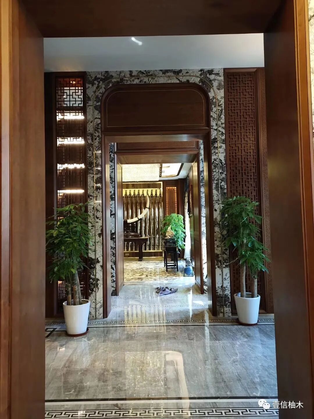 中式的柚木雕刻屏风与现代金属屏风相结合做隔断,加上灯光的设计,绿植的摆放处处布满着生机。玄关台上的象牙辟邪纳福 、安神镇宅。