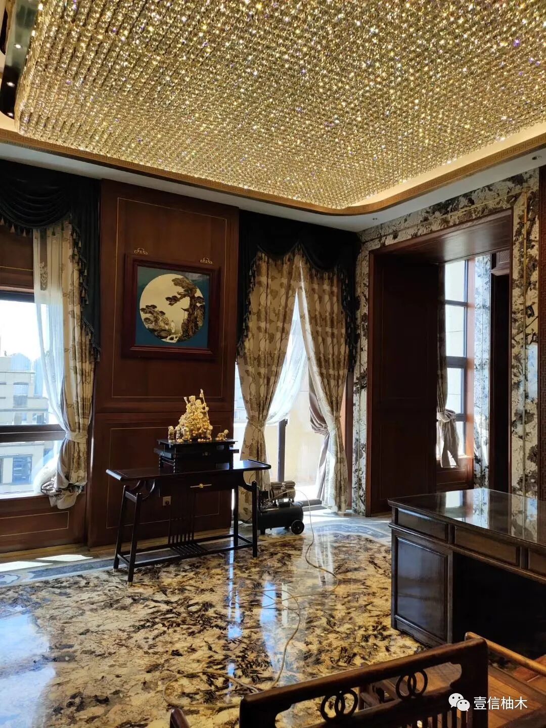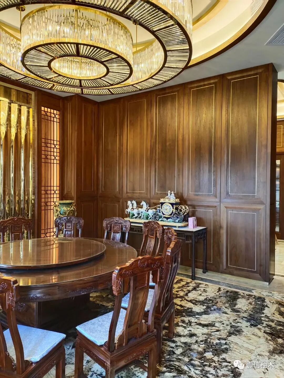 柚木护墙板与石材水晶灯相辉映,刚柔相济,护墙板上金属铜条的镶嵌,又添玲珑美。